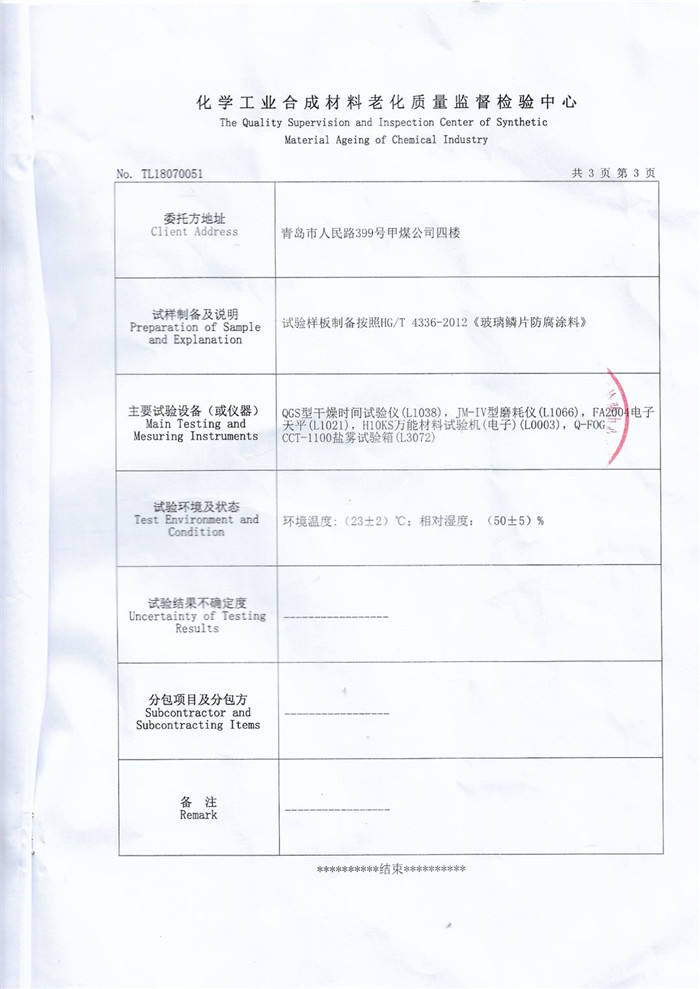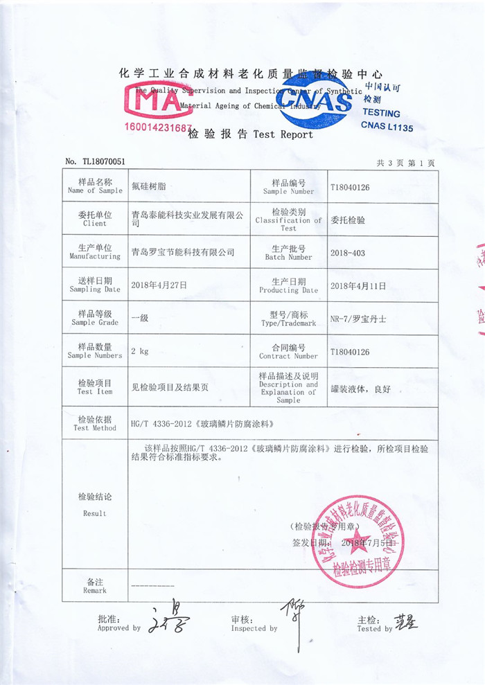 氟硅基玻璃鱗片防腐涂料(已申請國家發(fā)明專利) 該防腐涂料采用的基料是:具有國際先進技術(shù)的發(fā)明專利產(chǎn)品:羅寶·NR-7LP系列強滲透性氟硅防腐樹酯【IPN互穿網(wǎng)絡(luò)聚合物】作為基料(單組分),復合添加玻璃鱗片等納米材料復合而成。 采用獨特的噴涂、刷涂施工工藝,使復合材料在氧存在的條件下與空氣中的水分子發(fā)生反應(yīng),固化后可達到與陶瓷媲美的性能和效果。 優(yōu)勢是;單組分氟硅樹脂,施工過程中沒有可燃性溶劑的添加,耐高溫300℃具有防火性能、施工工藝技術(shù)簡單,可噴涂、滾涂施工,施工時間短(是傳統(tǒng)鱗片膠泥防腐施工時間的1/3)及超強的耐磨性、耐各種酸、堿、鹽的腐蝕,具有極高的硬度(邵氏93)和韌性不容易被損壞和開裂,(后續(xù)維護工藝簡單、費用小)表面噴涂含有石墨烯的納米氟硅復合樹脂,(如有特殊耐磨要求則噴涂添加碳纖維成分的氟硅防腐材料)使脫硫塔內(nèi)壁表面更加異常堅硬、強韌、光滑、耐磨使?jié){液不容易附著,所以使用壽命更長久,可在零下50℃環(huán)境溫度下施工的涂料。 為了區(qū)分其他系列玻璃鱗片防腐涂料,氟硅基玻璃鱗片采用天(酞)藍顏色加以區(qū)分